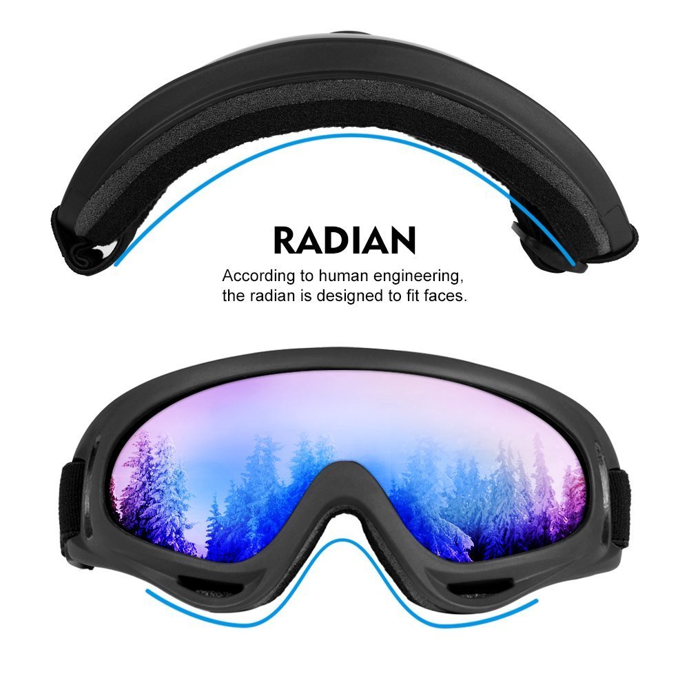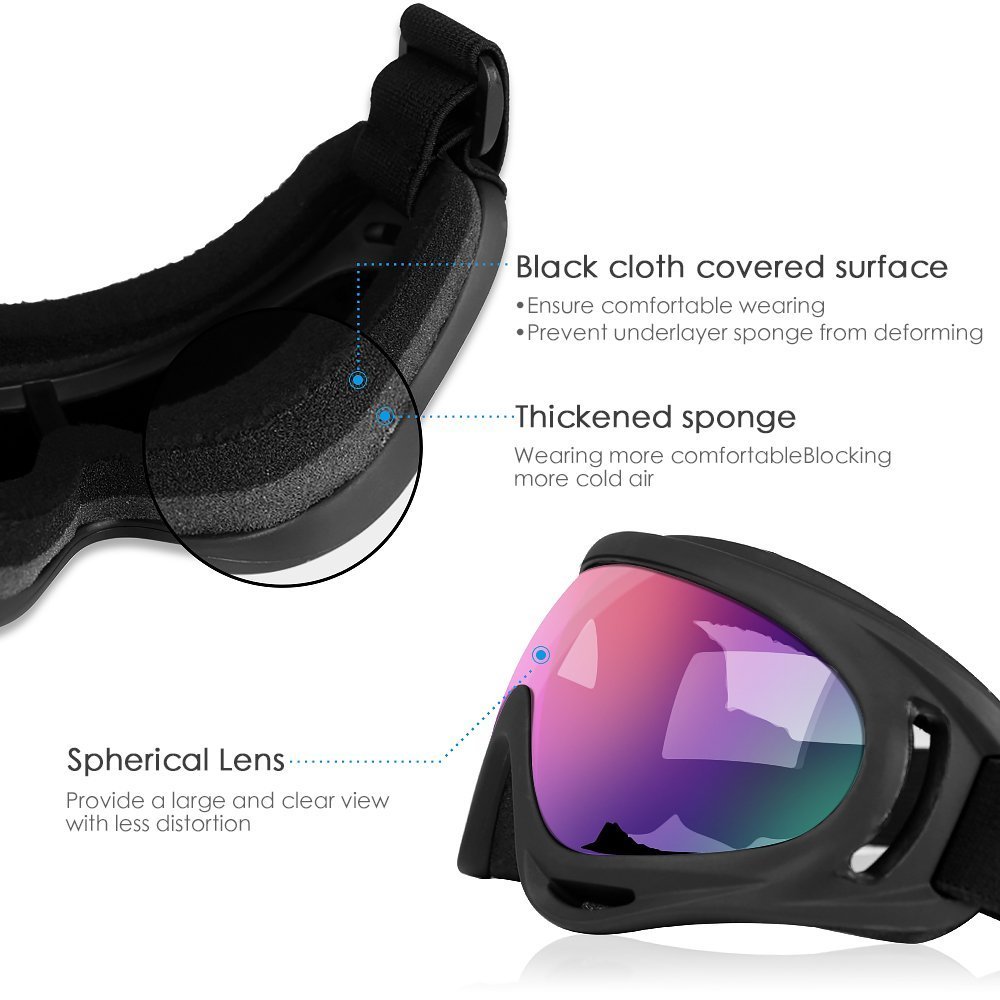 High quality and lower price snowboard goggles, wind/dust proof and UV 400 protection lenses avoid the sunlight damaging your eyes in sunny days, no fear of harmful lights / obstacles or dust!