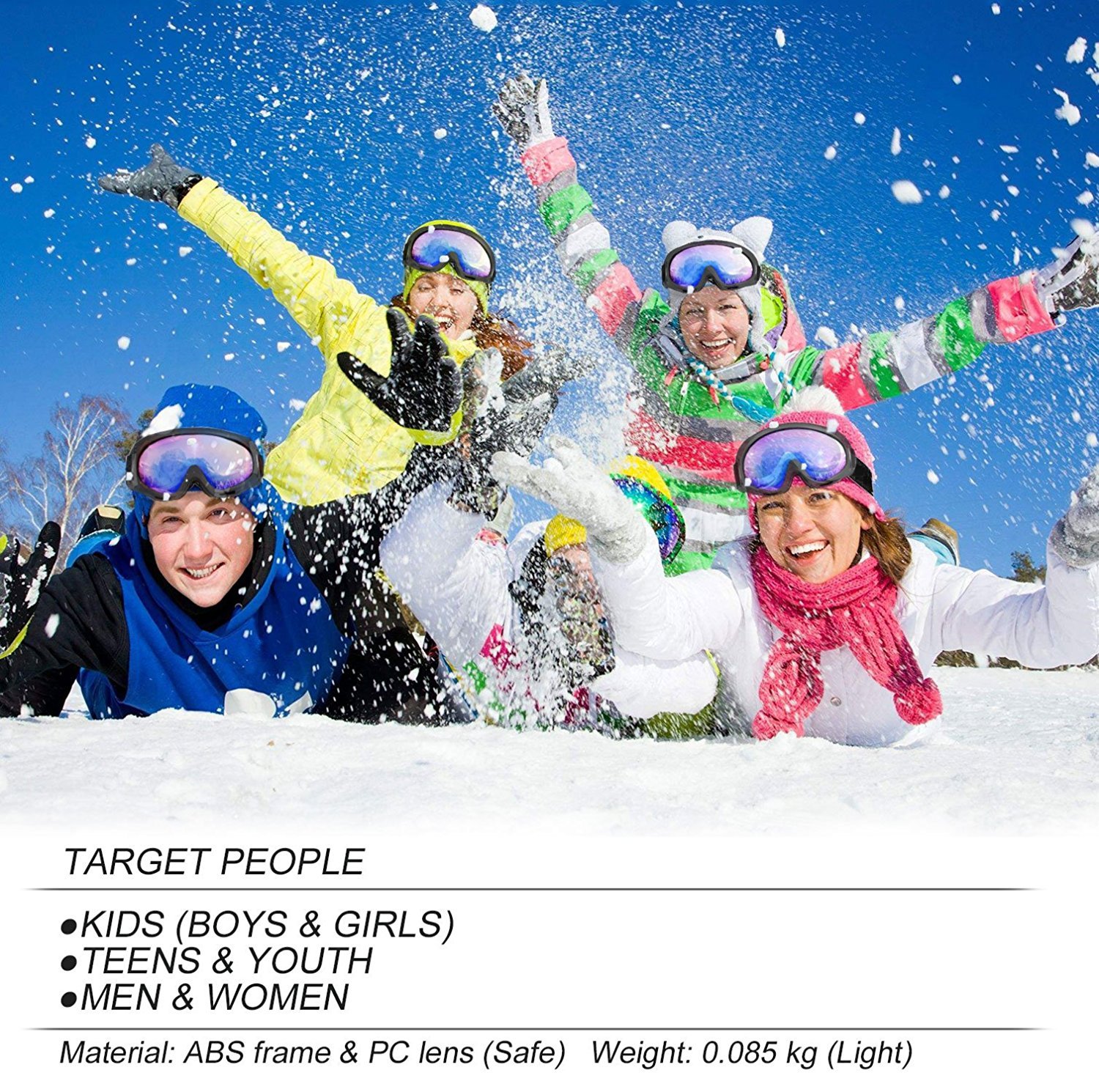 With adjustable strap, our ski goggles are suitable for women men kids girls and boys. And it’s only 2.6 ounces, feel comfortable even wearing it for a long time.