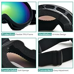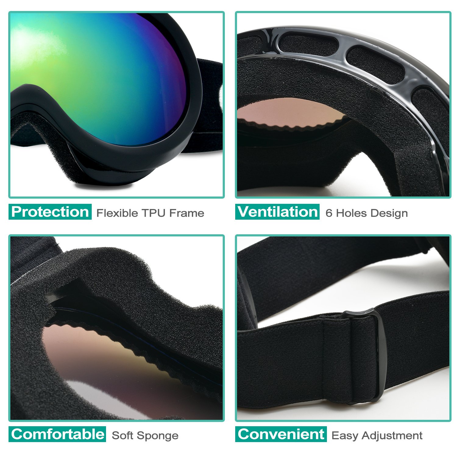 Great Anti- Fog System snowboarding goggles: Made of double lenses and the inner lens is anti-fog coating. Both of these provide great effect in anti-fogging. Also the sponge ventilation holes on the top and bottom of goggles accelerate ventilation of the cold and hot air, making the goggles always staying in dry state.